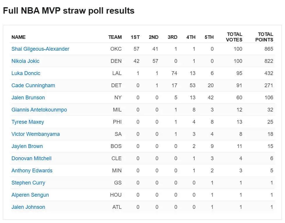 而且从历史看,本赛季之前,ESPN 最后一次模拟的第一最终全部当选了 MVP,包括字母哥、约基奇、恩比德、亚历山大。其中上赛季,ESPN 最后一次模拟结果:亚历山大 77 票,约基奇 23 票。最终的真实结果则是:亚历山大 71 票,约基奇 29 票,非常接近。