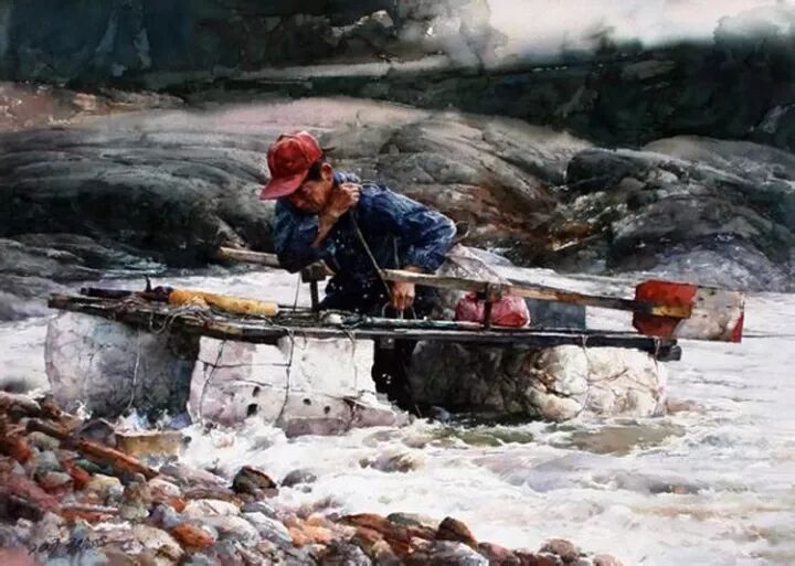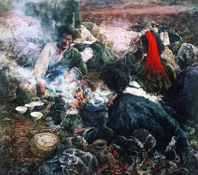 他的《酥油茶》、《奶茶》等水彩人物,以油画般的色彩、富有涨力的国画线条、立体主义的形象和传统国画人物的神态、情景与笔墨的交融,强烈的烘托出视觉气氛,那恍然如梦、如诗、如歌的意境,深深的震撼着观者的心灵。画面中那慈祥忧郁的阿爸,那天真无邪的孩童,那佝偻负重的阿妈,仿佛在诉说着一个民族艰辛的历史,诠释着一代又一代人寂寞的命运。