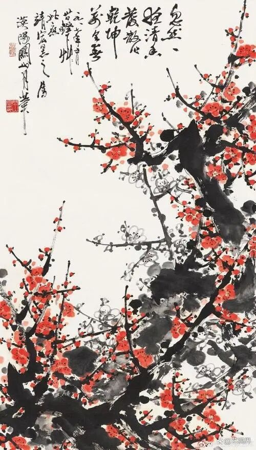 他的梅花,跳出了古代文人的小情小调。没有顾影自怜,没有伤春悲秋。只有一股劲,一股向上的、不屈的、滚烫的生命力。