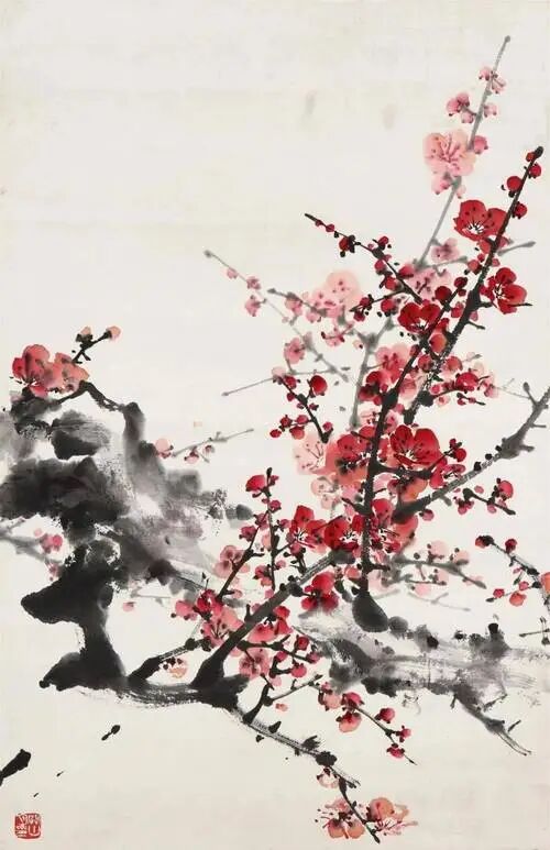 黑墨枝干,配雪白梅花,强烈对比,冲击力拉满。再看红梅,朱砂点染,红得正,红得烈,像一团团烈火在枝头燃烧。