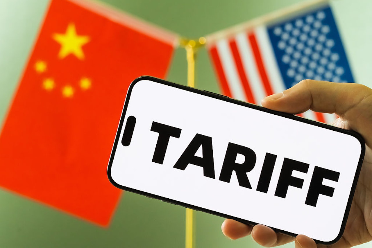 2025年8月12日,图为一名男子手持智能手机,屏幕上以粗体字显示“关税”(tariff)字样,背景可以看见中国和美国的国旗。(Getty)
