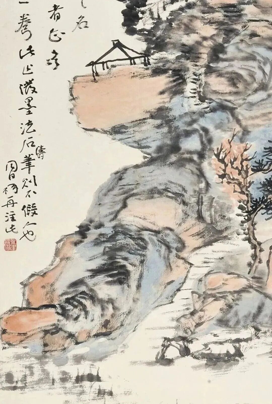 山石不用浓墨猛擦,淡淡皴染铺开,轮廓柔和圆润,没有凌厉棱角。线条舒缓从容,一笔一画走得慢悠悠,透着从容底气。