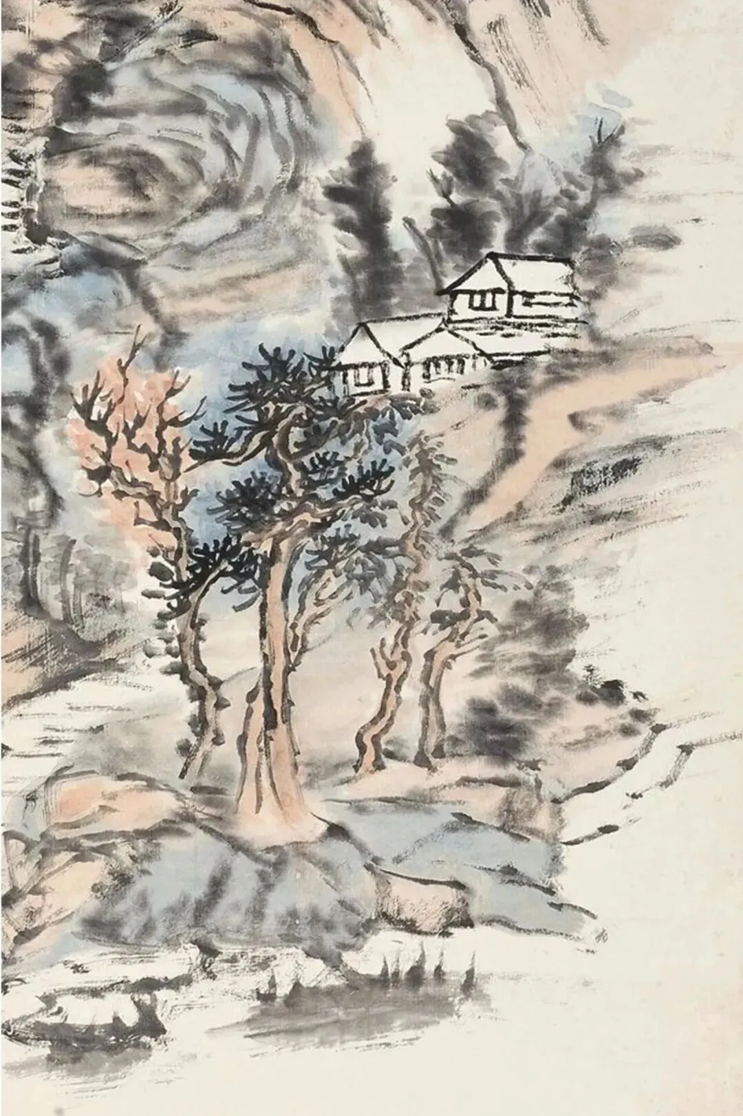 远山朦胧虚化,层次轻轻推开,氛围感瞬间拉满。他本身书法功底极深,画画也带着写字的韵味。
