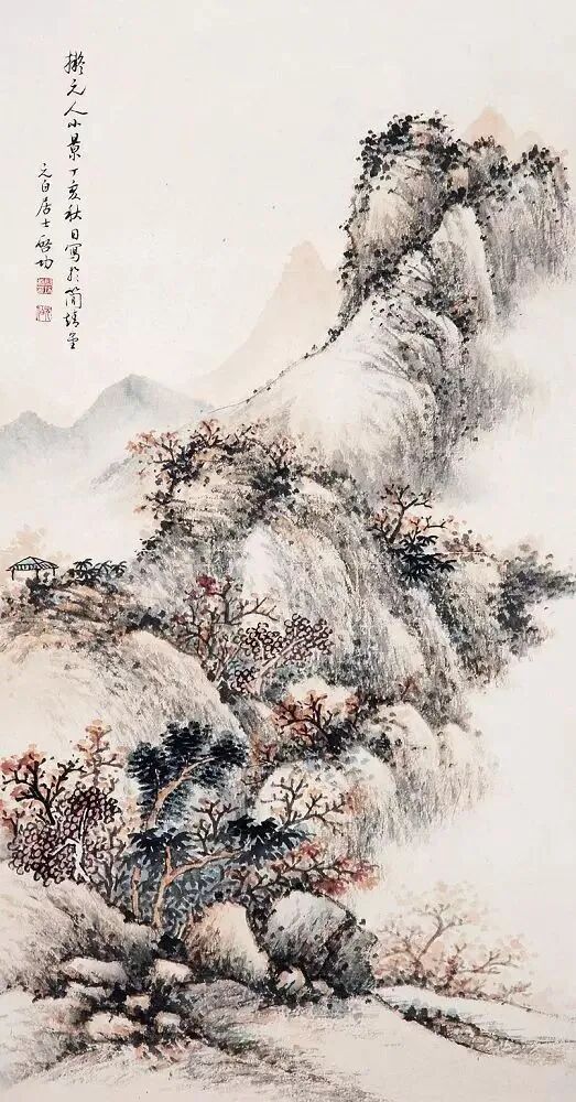山石线条极简,轻轻勾勒,不刻意皴擦堆叠。轮廓圆润柔和,看着安稳雅致,一点不张扬浮夸。