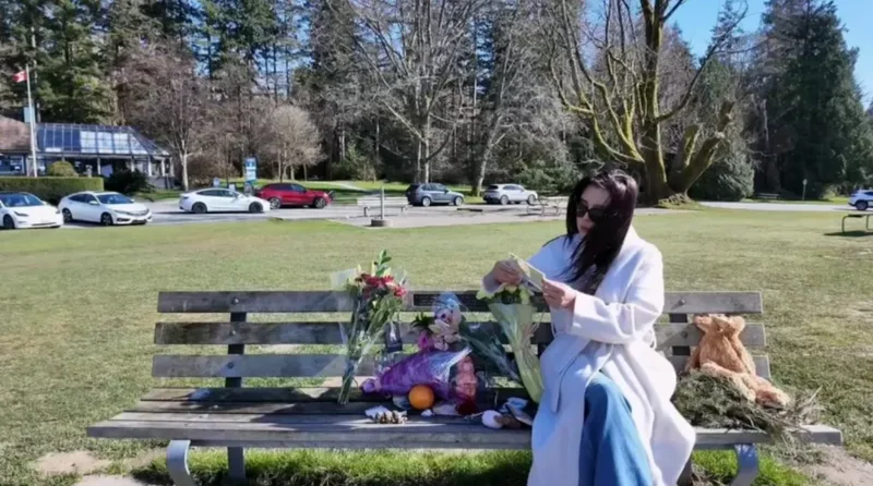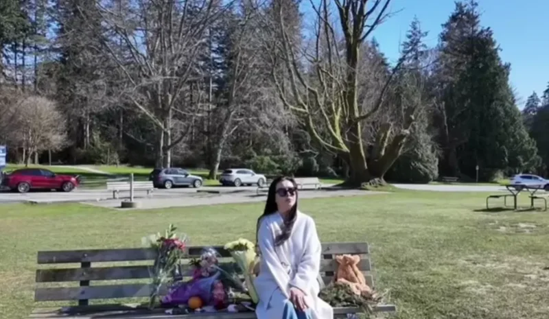 她戴着墨镜,现身温哥华史丹利公园(Stanley Park)的料峭春寒中。