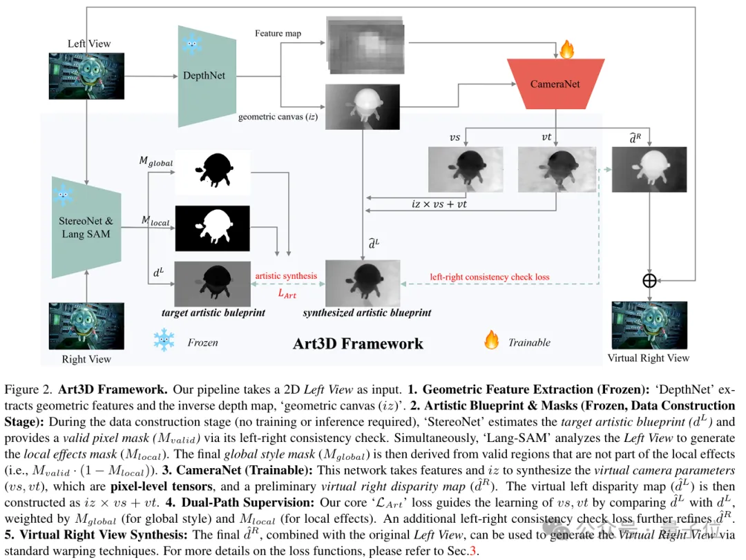 针对行业核心痛点,团队打造Art3D框架,摒弃传统单线机械生成逻辑,首创双路径解耦机制,兼顾艺术表达与物理严谨性,让AI真正学会像院线立体总监一样思考: