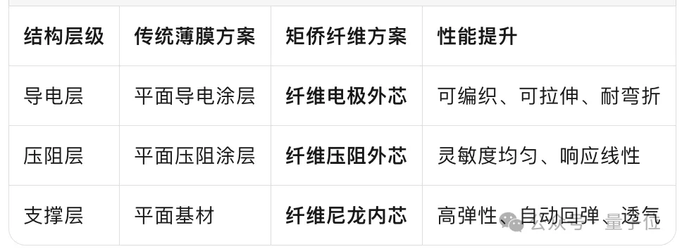 而矩侨的创新方案将三层结构完全解构为纤维化形态:纤维尼龙内芯+纤维压阻外芯+纤维电极外芯。