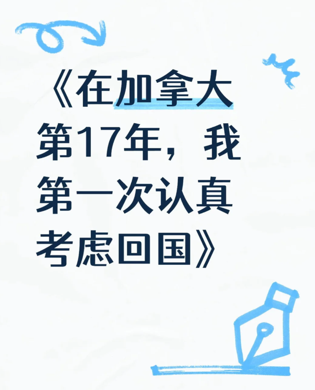 有那么一些人,在加拿大漂泊多年,看遍了枫叶落尽与极光变换,心中的天平终向故土倾斜。这不仅是一次地理上的回归,更是生活重心的推倒重建。面对国内飞速的发展与熟悉的烟火气,有人决定放下过往,开启这场跨越山海的人生下半场。也有人内心安稳,静悄悄地享受岁月静好。一位网友征求建议:该如何选择?