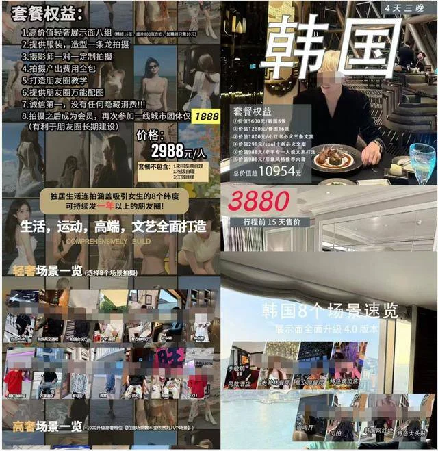 有商家透露现在这个市场很卷,因此赛道内逐渐分化出一对一定制拍摄、带团去旅游城市和国外拍摄。某位商家提供的报价单显示,去韩国拍摄明星同款酒店、特色烤肉店等售价近4000元/人。此外他们还计划后续去欧洲多国环游拍摄,费用就有点高了。