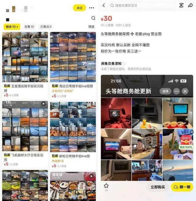 目前实况照片的售价普遍在3-30元/张,通常日常照最便宜,头等舱、高尔夫、邮轮等则价格稍高。蓝鲸新闻此前曾报道,一些卖家还接受定制代拍,按照买家要求的角度、光线、效果来拍摄,有时会配合摆放挂件、举牌等。比如定制头等舱实况图需500元起,指定航司可能高达1000元/张。