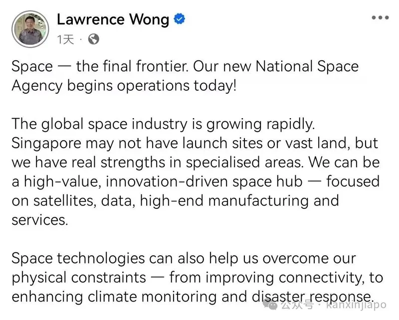 4月1日,新加坡总理黄循财在脸书发布这段文字,宣布新加坡国家航天局(NSAS)正式挂牌成立。他没有用冗长的致辞,而是引用了那句经典的《星际迷航》开篇语。这个没有传统航天工业的城市国家,正以国家力量杀入万亿美元级的全球太空经济赛道。