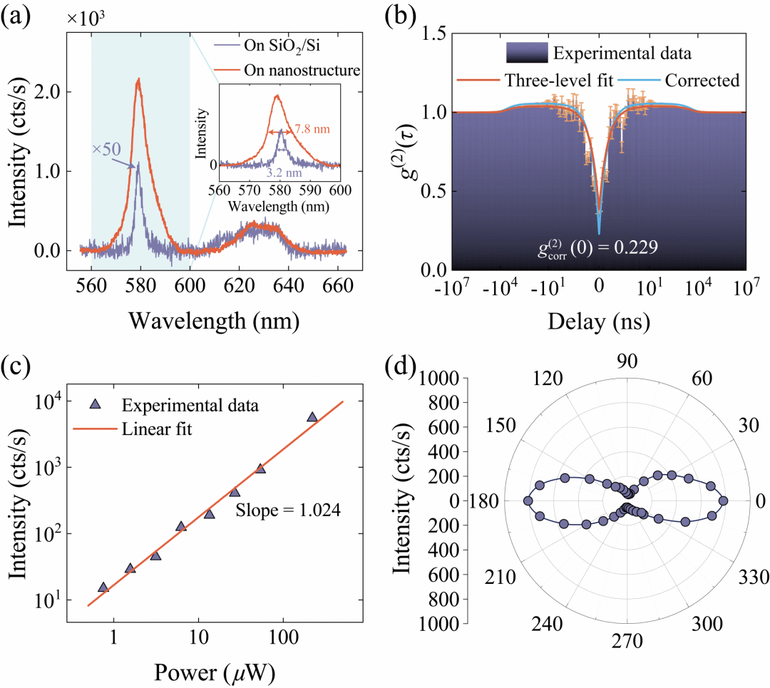 图2 单光子源的远场光学表征。(a)单光子源的远场发射光谱。(b)单光子源的二阶关联函数测量。(c)单光子源强度的激发功率依赖关系。(d)单光子源的偏振图样。