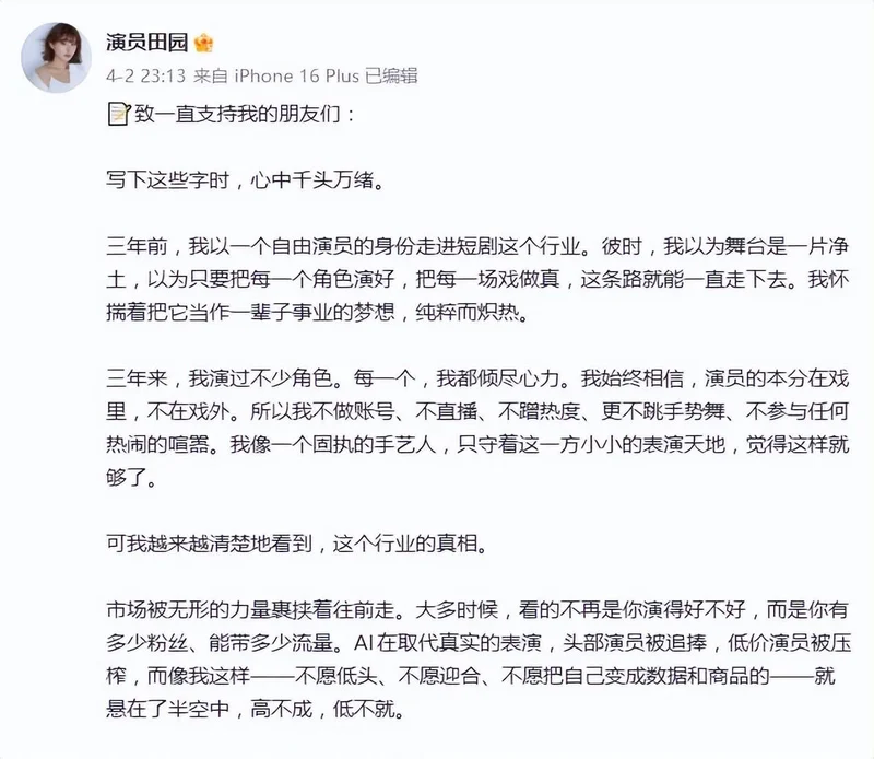 4月2日,一则退圈声明在短剧圈投下石子。26岁的短剧演员田园发布长文,宣布告别演艺行业。这篇充满“手艺人的固执”与“理想主义者的悲凉”的告别信,不仅是一位演员的转身,更像是一封直指行业病灶的公开控诉。