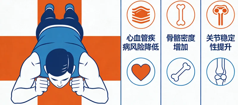 研究证明,俯卧撑能力是心血管疾病风险的强预测指标。能完成更多标准俯卧撑,通常意味着心脏更强大、心血管系统更健康。