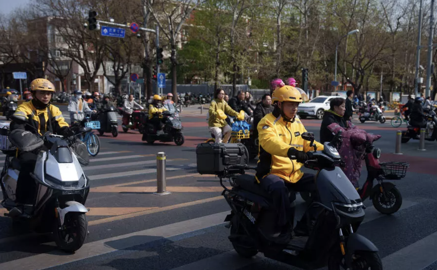 4月2日,外卖员骑着电摩托行走在北京的街道上。 © 美联社图片