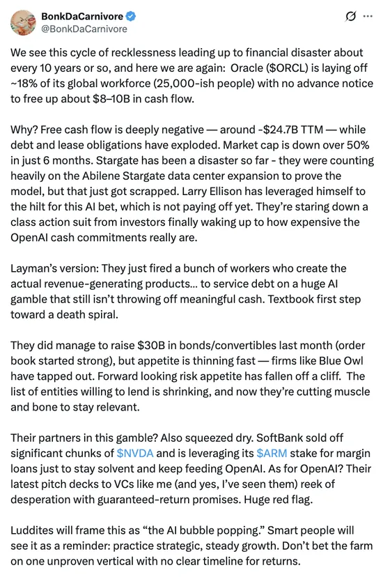 埃里森疯狂押注的Stargate AI基建项目承诺投入将超过2000亿美元,目前整个公司正处于极度杠杆化的高危状态。据博主爆料,随着银行融资渠道的收紧以及市值较半年前峰值的腰斩,甲骨文只能饮鸩止渴,通过极端的降本增效来强行维持这场豪赌。