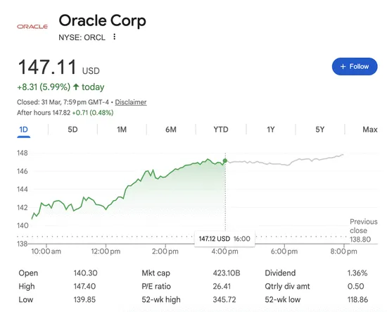 残酷的是,这种拿员工开刀的做法确实换来了立竿见影的短期资本狂欢。就在裁员消息爆出的周二当日,甲骨文股价收于每股147.11美元,大涨5.99%,并在盘后交易中依然维持了强劲的涨势。