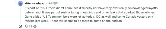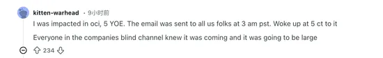 一位在甲骨文OCI部门工作了5年的老员工在Reddit上大吐苦水,他表示解雇邮件是在太平洋时间凌晨3点统一发给所有美国员工的,而身处中部时间的他早上5点醒来就遭受了这当头一棒。