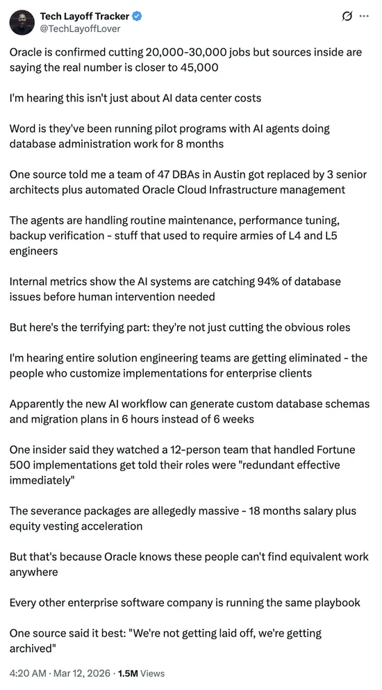 其中最令整个技术社区感到后背发凉的,是科技博主@TechLayoffLover在X上爆出的一则猛料。甲骨文内部其实早就已经悄悄试运行AI智能体来从事数据库管理工作,且长达8个月之久。