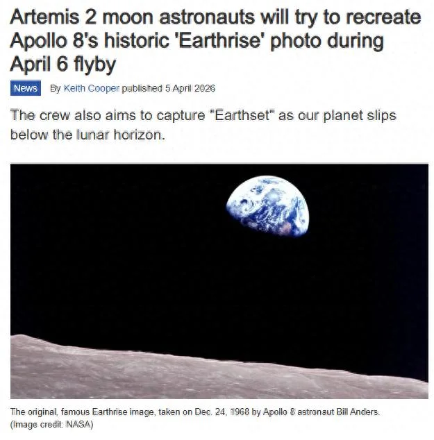 IT之家从文中获悉,阿波罗 8 号是首次实现载人绕月的航天任务,时隔 57 年多,阿尔忒弥斯 2 号将于美国当地时间 4 月 6 日(星期一)飞掠月球背面。在绕月飞行过程中,阿尔忒弥斯 2 号宇航员计划重现地出照片,希望这张新照片能像原作一样,起到凝聚人类共识的作用。