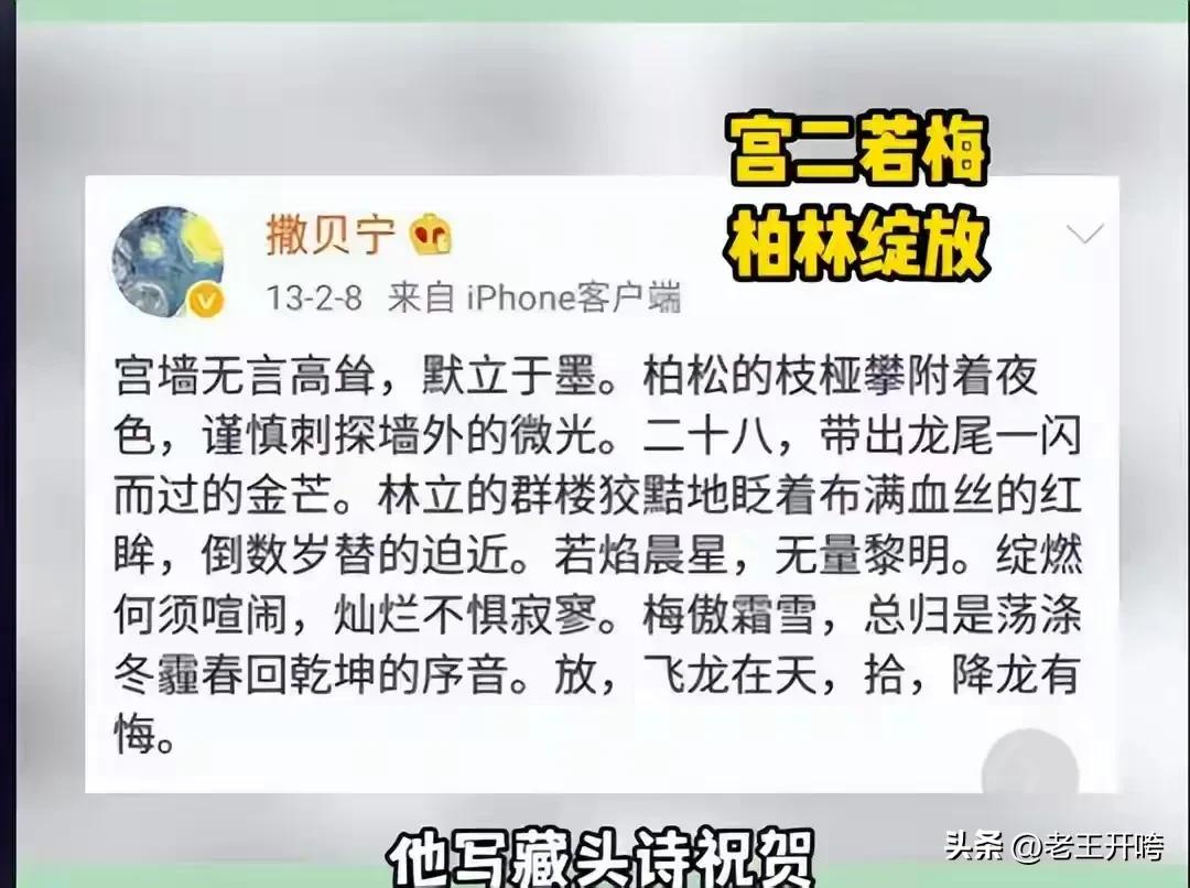 当章子怡凭《一代宗师》赴柏林参赛时,他写藏头诗“宫二若梅,柏林绽放”遥祝。