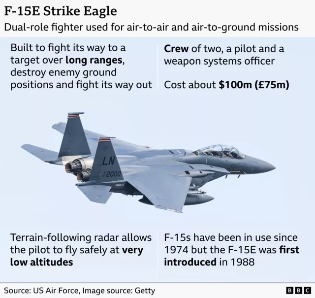 F-15E 打击鹰式战机(F-15E Strike Eagle)设计用于执行空对地与空对空任务。在伊朗上空,它最可能担任防御角色,负责击落伊朗无人机和巡弋导弹。在空对地攻击任务中,这款战机能够投掷雷射与 GPS 导引的精确弹药,以及其他炸弹。