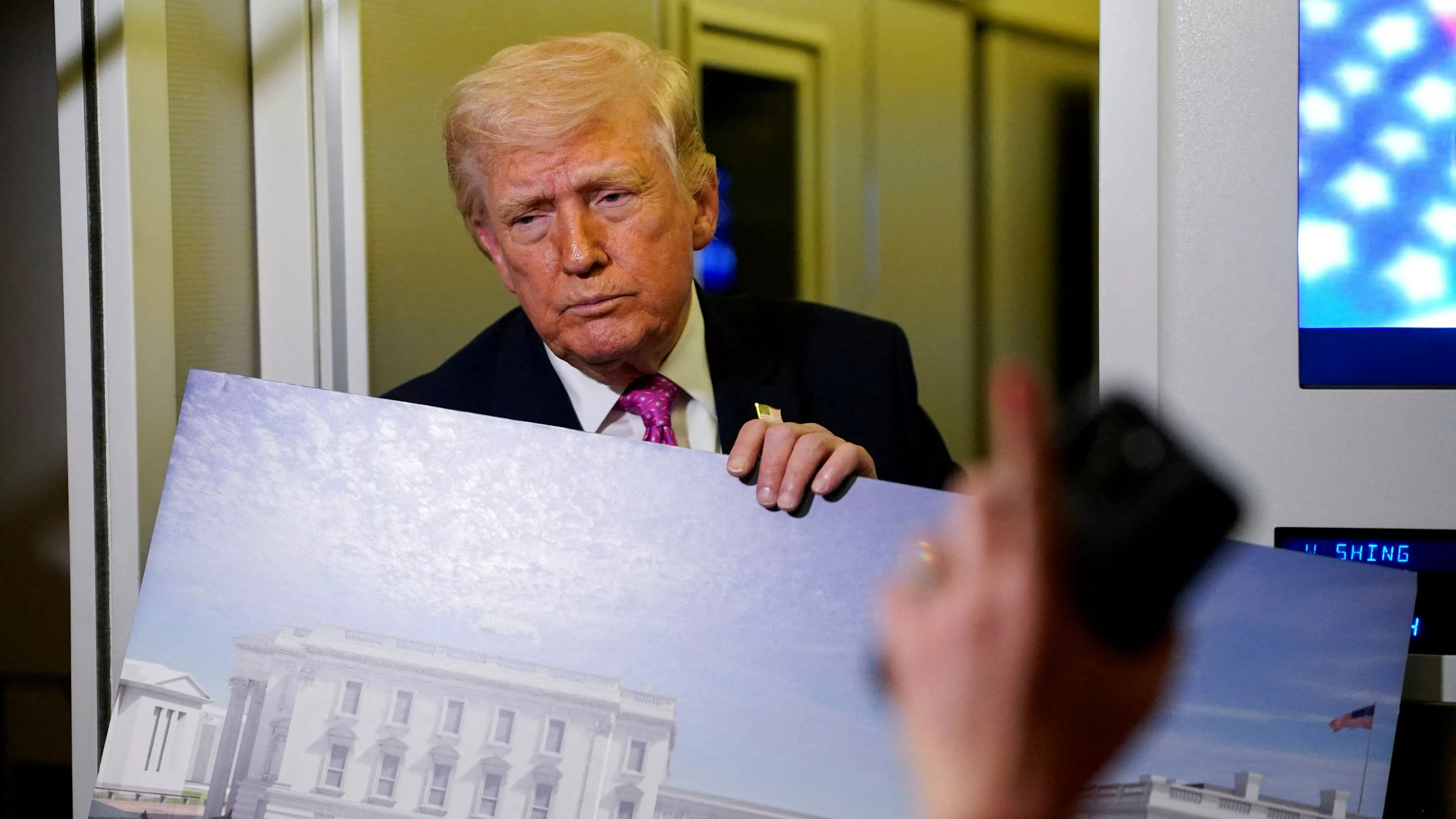 2026年3月29日,美国总统川普(Donald Trump)在空军一号上发表讲话,同时手持白宫宴会厅的设计图。(Reuters)