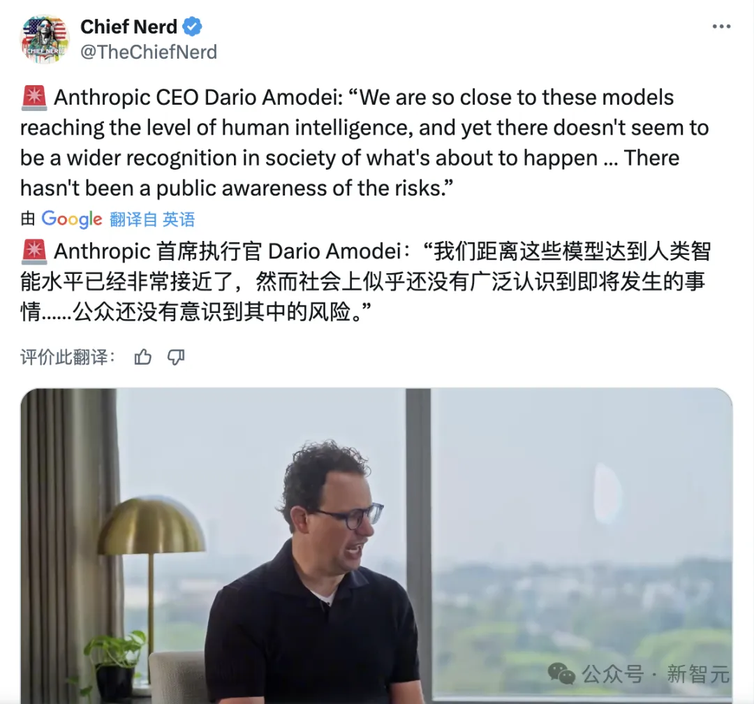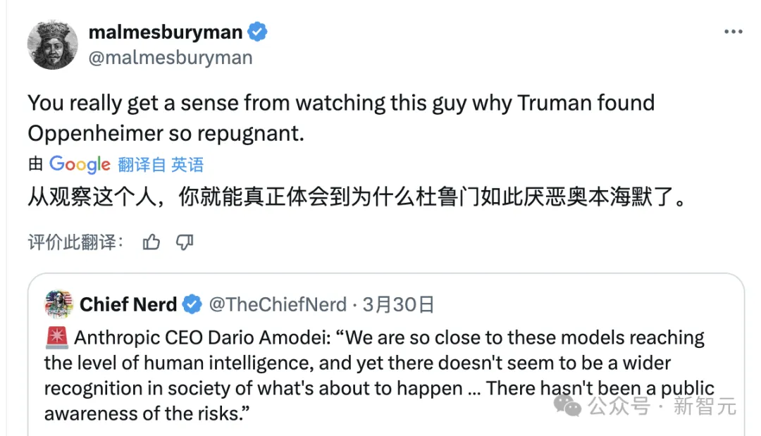 用户@malmesburyman转发了Anthropic CEO Dario Amodei的采访片段,配文:
