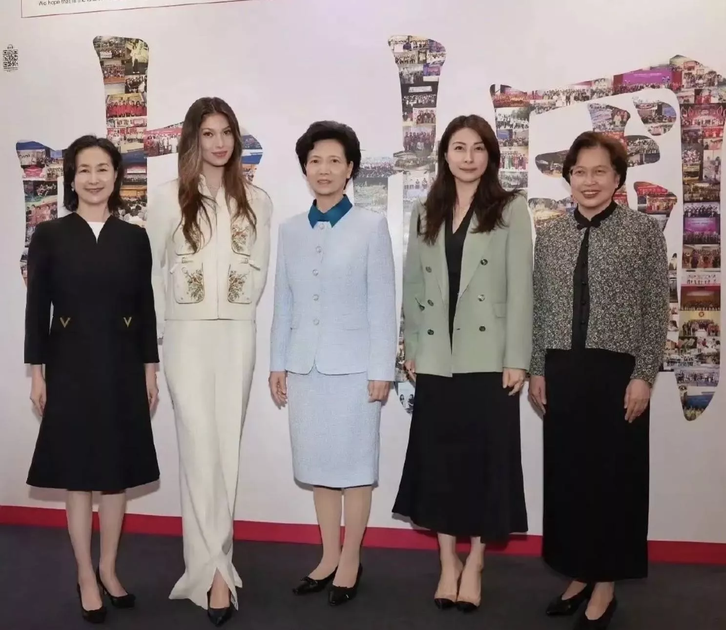 郭晶晶当天是以杰出女性领袖的身份出席活动,实际上她的家翁霍震霆也在场。翁媳出席同一个活动,这早就见怪不怪,重点是两人不是谁陪同谁出席,而是各自受邀,说明郭晶晶或是霍震霆在香港都有着极高的影响力以及社会地位。霍震霆是以公职的身份出席这个活动,在性质上与何超琼一样,所以在领导、领袖大合照的时候,霍震霆与何超琼都站在了主席台上合照,彰显出了社会地位。