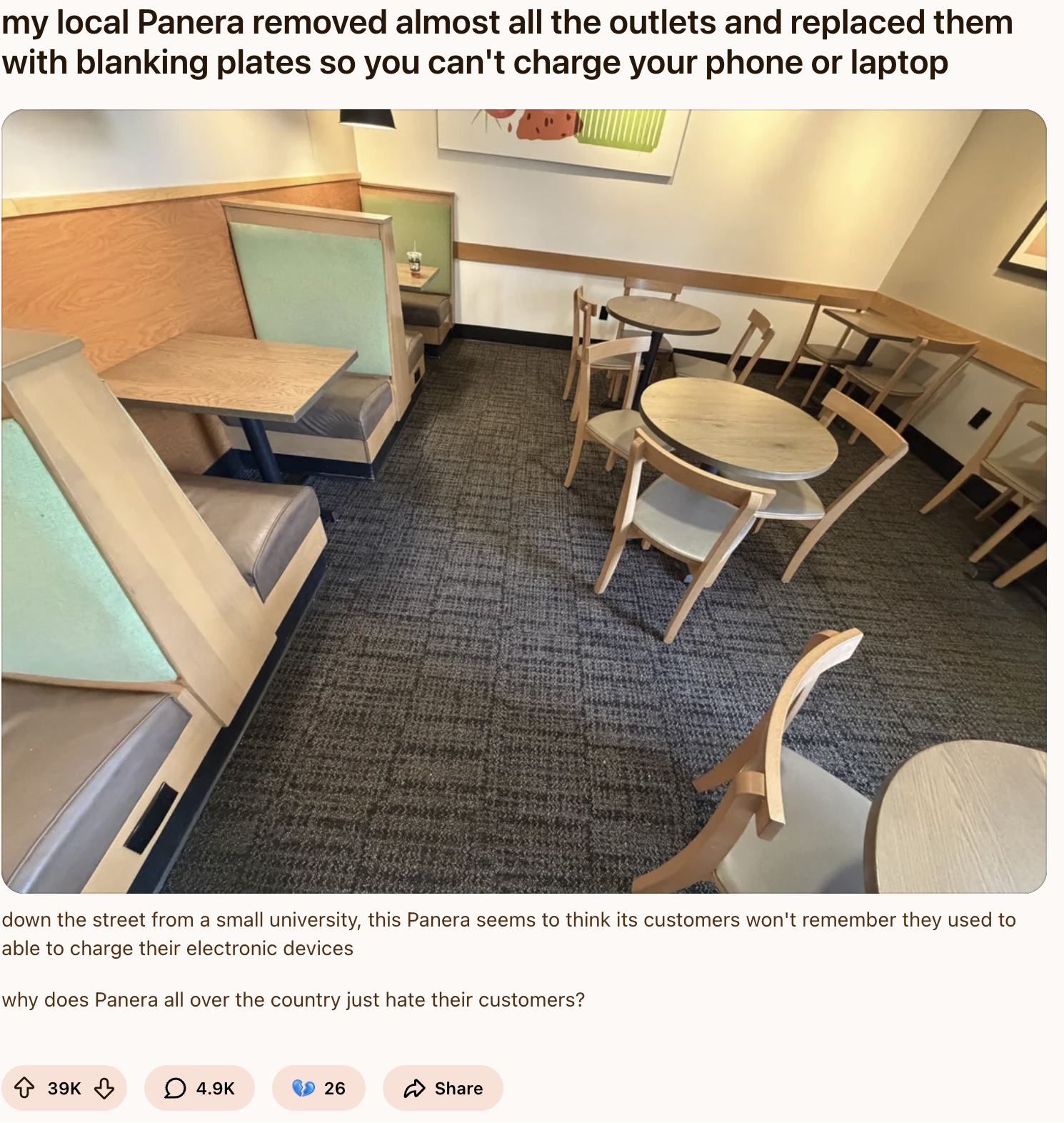 据网友平台发帖,他晒出店内照片,并愤怒表示:“Panera是不是觉得顾客不会记得以前还能充电?”从图片中可以看到,原本的插座位置已被统一封闭,取而代之的是整齐却冷冰冰的白色面板。这种“物理消失”的做法,让不少人感到不适。