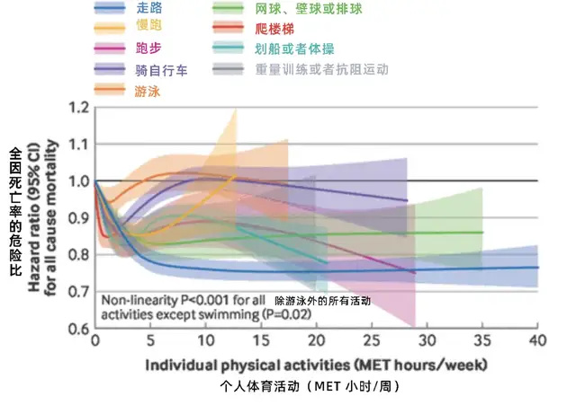 这项研究还有一个让人意外的结论:在总运动量差不多的情况下,运动种类越丰富,死亡风险越低。