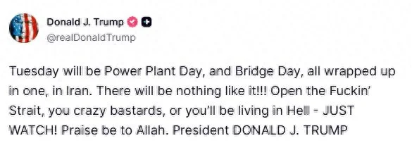 特朗普在社交媒体上发文说,“4月7日将是伊朗的发电厂日和大桥日”,暗示要猛烈轰炸伊朗的发电厂和大桥。他还说:“打开那个该死的海峡,否则你们将活在地狱中——走着瞧!”