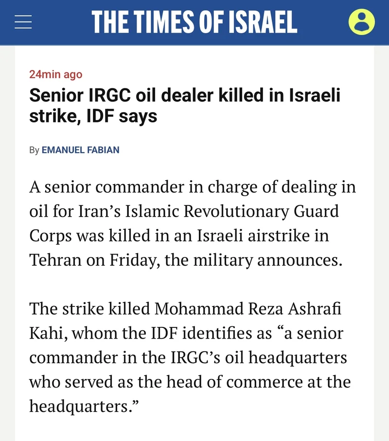 报道说,此次空袭导致穆罕默德·礼萨·阿什拉菲·卡希(Mohammad Reza Ashrafi Kahi)死亡,以色列国防军(IDF)称,卡希为“伊朗革命卫队负责石油的高级指挥官,曾担任军队石油部门的商务主管”。