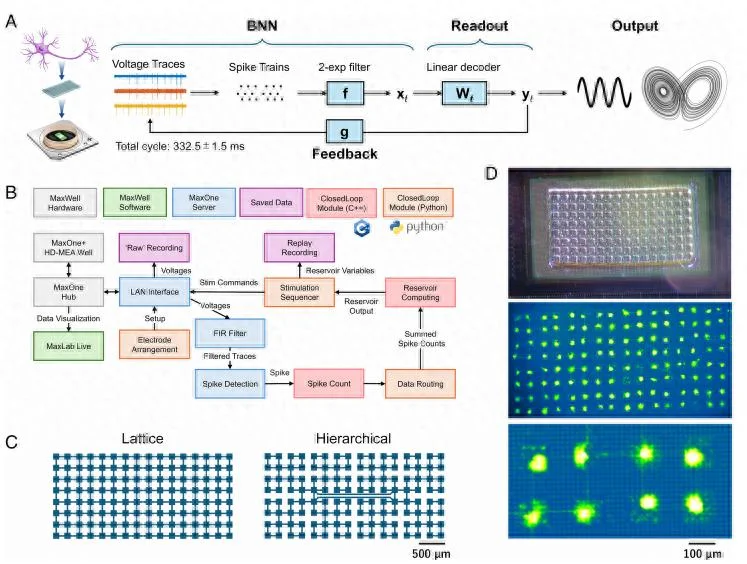 研究人员在由 26,400 通道构成的高密度微电极阵列上培养神经元,其动作电位被实时记录、滤波后转化成连续信号。然后,经由线性解码器映射为目标输出。