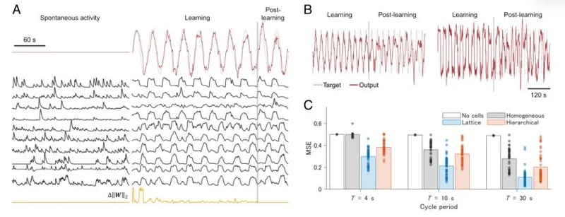 他们通过应用 FORCE 学习算法优化系统的读出层,不仅显著降低了内存需求,还成功训练这些生物网络,使其能够产生与运动控制中类似的复杂时间信号。研究人员基于这种方法构建了模块化网络架构,可最大限度避免神经元过度同步,让网络呈现出高效储层计算所需的丰富、高维动态行为。