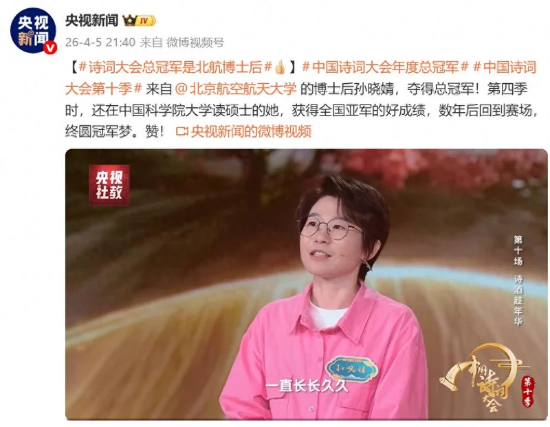 随后“中国科学院大学”微信公众号发布消息:在实验室里,孙晓婧的日常与精密数据、空间环境模型相伴;而在4月5日晚总台央视《中国诗词大会(第十季)》年度总决赛舞台上,她以满腹诗华摘得冠军,让航天人的浪漫被更多人看见。
