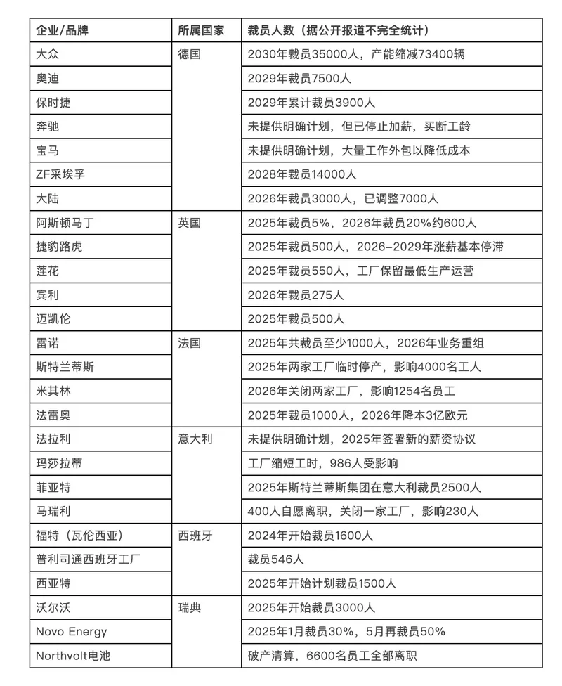 几个主流的汽车产销大国——德国,法国,意大利,英国,西班牙,瑞典……已经开始大规模的集体裁员。