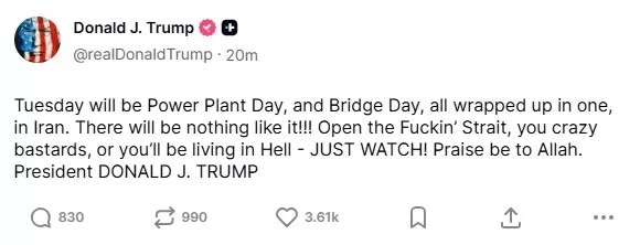 川普同日又在Truth Social发文,威胁会在周二攻击伊朗的发电厂与桥梁等基建设施。