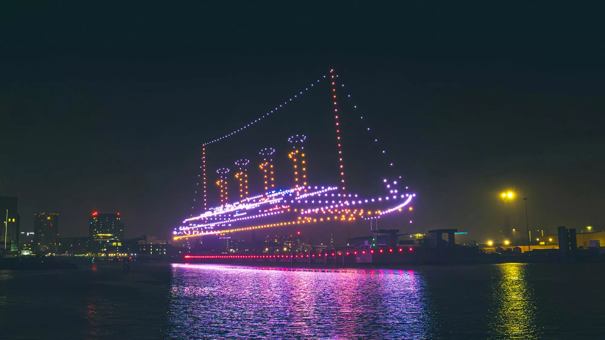 从片段可见,灯光闪烁的无人机编队,在短短几秒钟就组成了铁达尼号的型状。在漆黑的夜空映衬下,无人机构成的巨大影像栩栩如生地勾勒出“船体”的轮廓。