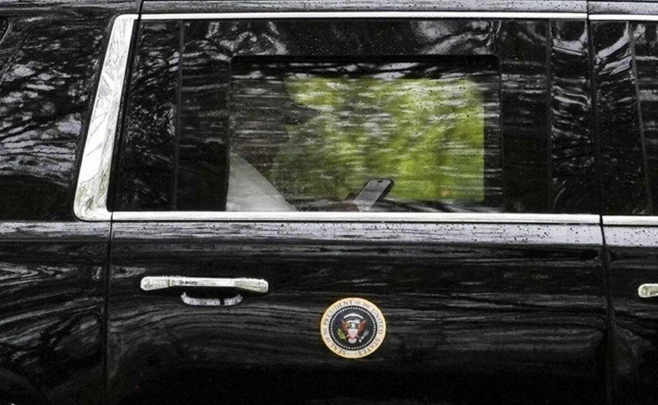 川普总统离开维州的川普国家高尔夫俱乐部时,坐在休旅车后座使用手机。 (美联社)