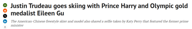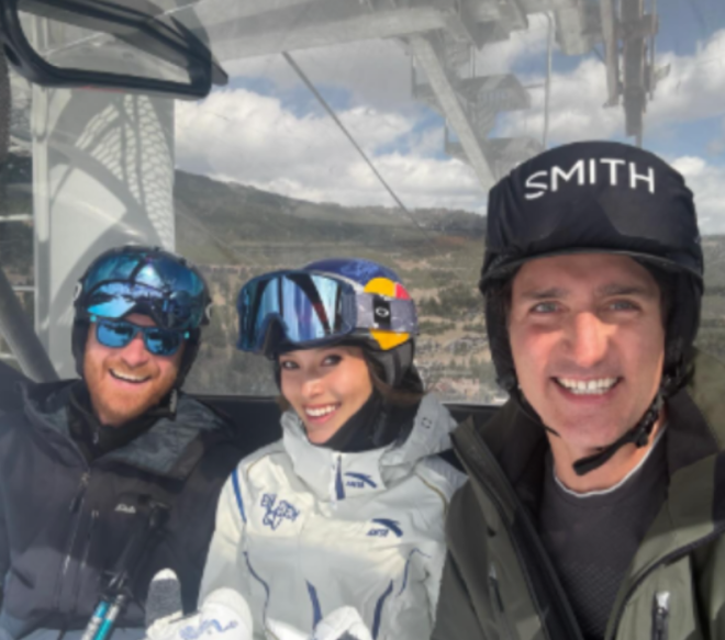 奥运冠军谷爱凌(Eileen Gu)本周在社交媒体上分享了一张照片,画面中加拿大前总理特鲁多(Justin Trudeau)和英国哈里王子(Prince Harry)一起坐在滑雪缆车上。这张照片是谷爱凌在周四发到Instagram上的,画面里三人穿着全套滑雪装备,一边坐缆车上山一边微笑合影。