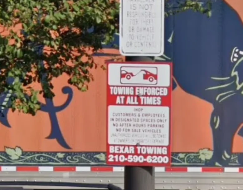 停车位边缘会写着“IHOP ONLY”,现场也有红色警示牌写明只限本店顾客使用、违规将被拖走,但这些标志要么数量不多,要么只朝向停车场内部,从外面开车进来的人很容易看不到,等真正意识到的时候,往往已经晚了。