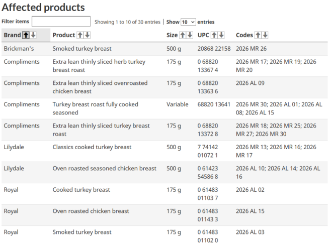 这次涉及的,不只是一些冷门品牌,反而很多都是大家平时经常买的。比如Compliments的火鸡肉、鸡胸肉,还有Selection的火鸡肉、烤肉产品,都在名单里。另外像Brickman's、Lilydale、Royal、Sysco、Ziggy's等常见品牌,也都有产品被点名,基本属于“你很可能买过”的那种。