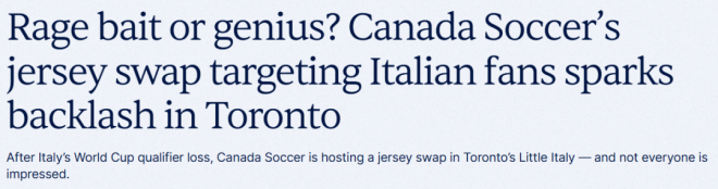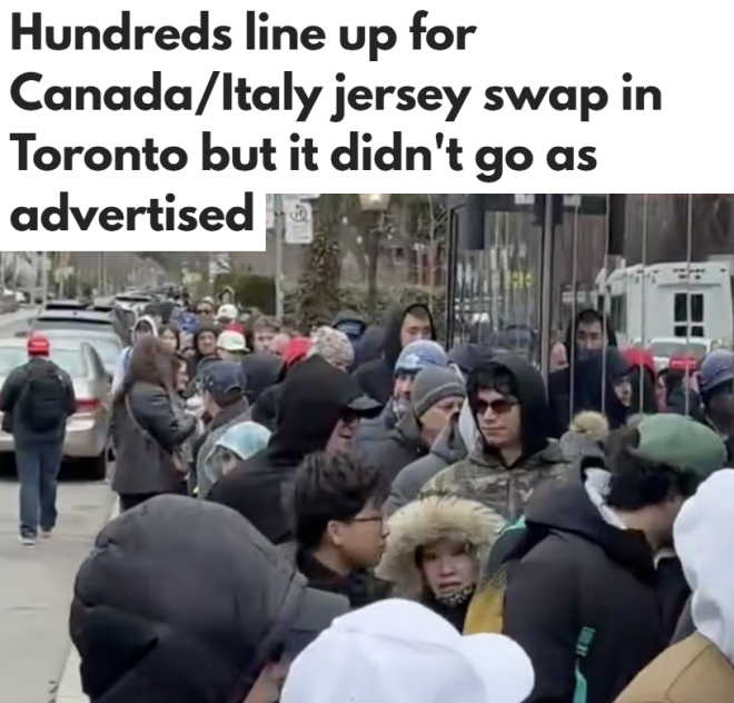 近日,加拿大男足国家队想“拉拢”意大利球迷,推出了一个球衣交换活动,于周六(4月4日)在多伦多举行,不过不少意大利球迷对此并不买账。本周,在即将到来的世界杯预选赛中,意大利国家足球队输给了波黑国家足球队,遗憾出局。趁这个时机,加拿大足协(Canada Soccer)向多伦多的意大利球迷发出邀请,希望他们转而支持加拿大队。