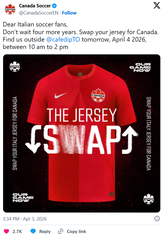 足协在X(前Twitter)上发帖写道:“亲爱的意大利球迷,不用再等四年了。把球衣换成加拿大的吧。明天来Café Diplomatico门口找我们。”