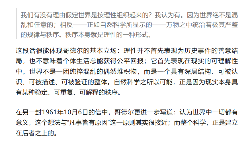 这里能看到他与莱布尼茨的深刻渊源。哥德尔和莱布尼茨一样,相信世界中的一切“如此而非彼然”,必有其理由。这一原则在哲学上被称为“充足理由律”。对哥德尔而言,现实之所以是理性的,并不是因为它总是温柔或公正,而是因为它并非不可理解;它有结构,有关联,有可读性。
