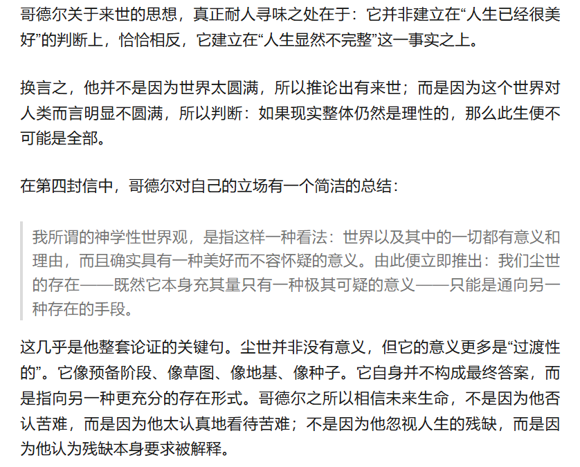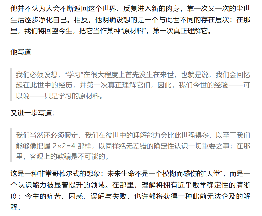 从这里看,哥德尔的来世观很容易被误解为某种轮回论。但至少在通常意义上,这并不是他想表达的内容。