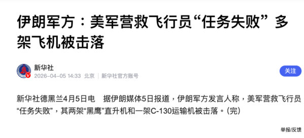 然而,北京时间4月5日14时33分,中共官媒新华社依然在一条题为“伊朗军方:美军营救飞行员‘任务失败’多架飞机被击落”的消息中声称,据伊朗媒体5日报道,伊朗军方发言人称,美军营救飞行员“任务失败”,其两架“黑鹰”直升机和一架C-130运输机被击落。
