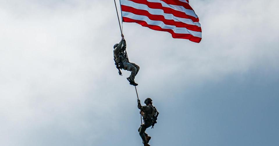 美国大兵一个个从天而降,三三两两精准降落,他们疑似就是将美国F-15E飞官救出的神秘队伍,号称美国空军瑞士刀的空降救援队。前美国海军陆战队员马克林:“美军空降救援队,他们就像空军的海豹部队或绿扁帽部队,他们很低调,他们是美军中最勇敢的部队。”