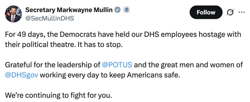 国土安全部部长穆林随即在社媒上感谢特朗普,并指责民主党立法者扣押“国土安全部的每一位员工”进行“政治戏剧”。